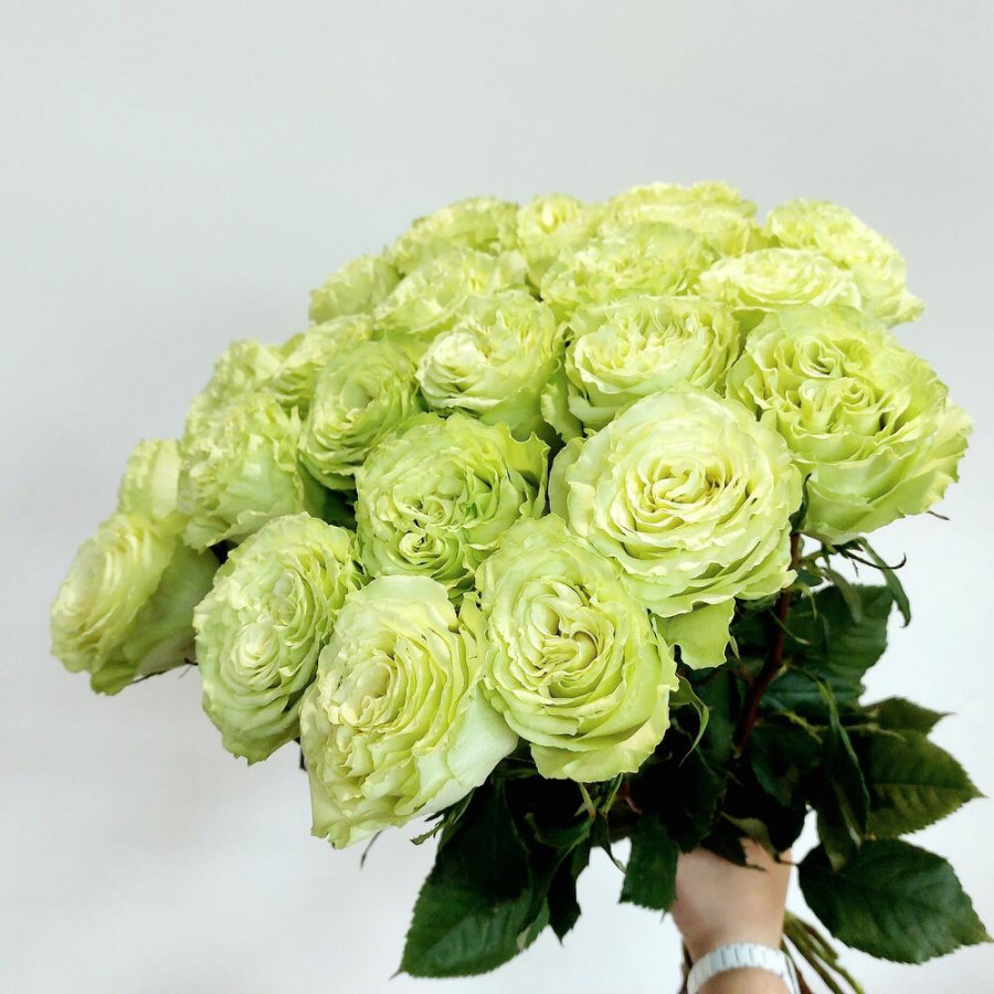 На фото букет из 21 зеленой розы. В составе: пионовидная роза 21 шт, атласная лента 1 шт, . Все цветы свежие и ароматные, букет красиво оформлен и отлично подходит для подарка. Доступна доставка цветов или самовывоз.