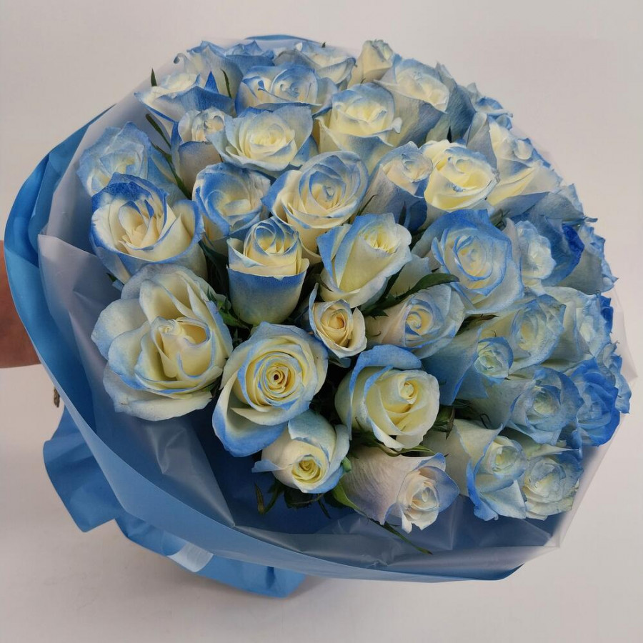 На фото букет из 41 голубой розы. В составе: роза 41 шт, дизайнерская упаковка 1 шт, атласная лента 1 шт, . Все цветы свежие и ароматные, букет красиво оформлен и отлично подходит для подарка. Доступна доставка цветов или самовывоз.