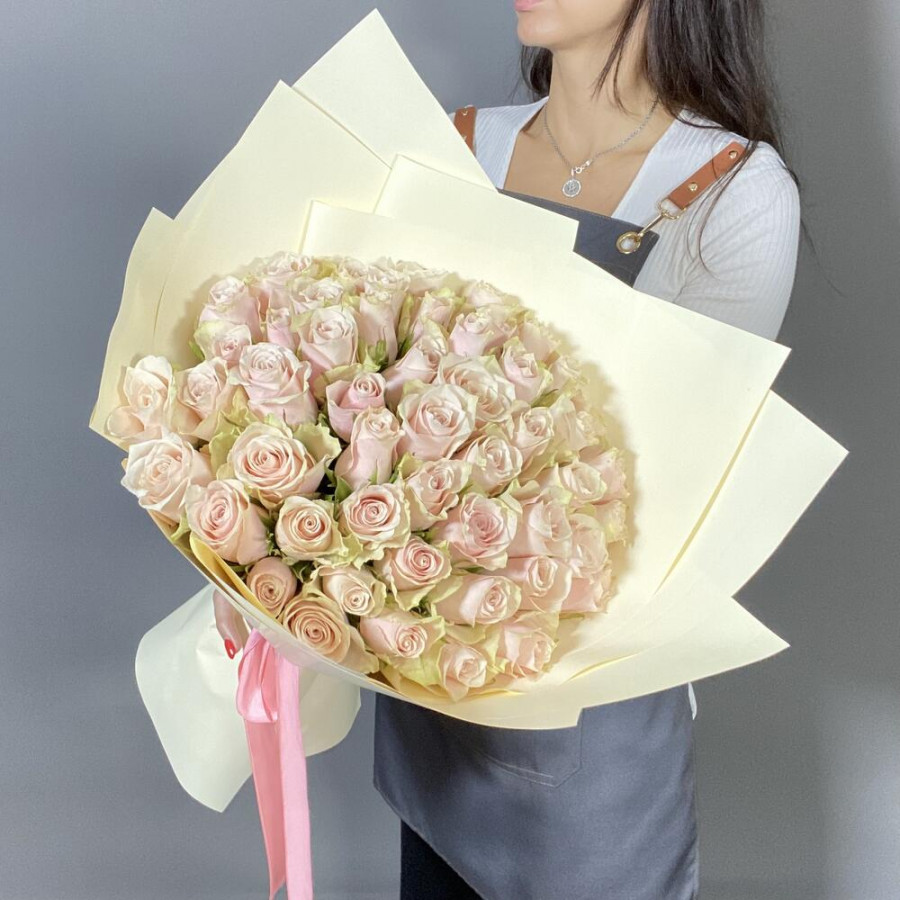 На фото букет из 51 кремовой розы. В составе: роза 51 шт, фоамиран 2 шт, атласная лента 1 шт, . Все цветы свежие и ароматные, букет красиво оформлен и отлично подходит для подарка. Доступна доставка цветов или самовывоз.
