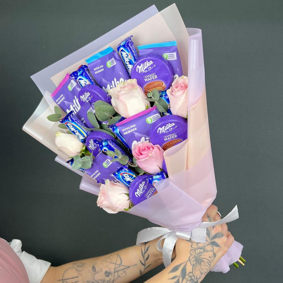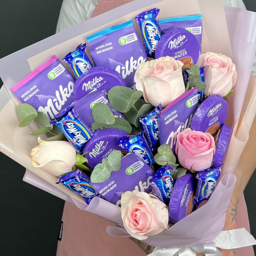 Букет из конфет Milka и розовые розы