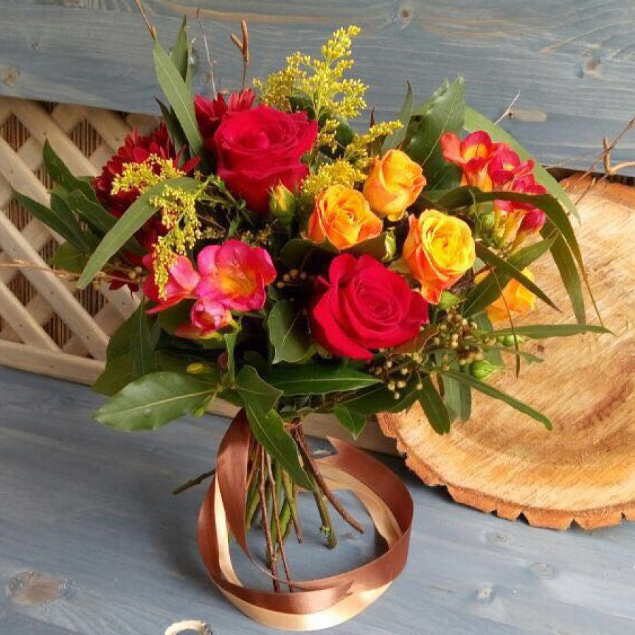 Красочный букет ярких оттенков осени из роз, альстромерий, рыжих кустовых роз и солидаго станет ярким украшением пасмурного дня и обязательно приятно удивит получательницу. Украсить день красавицы яркими красками поможет букет "Очарование осени".