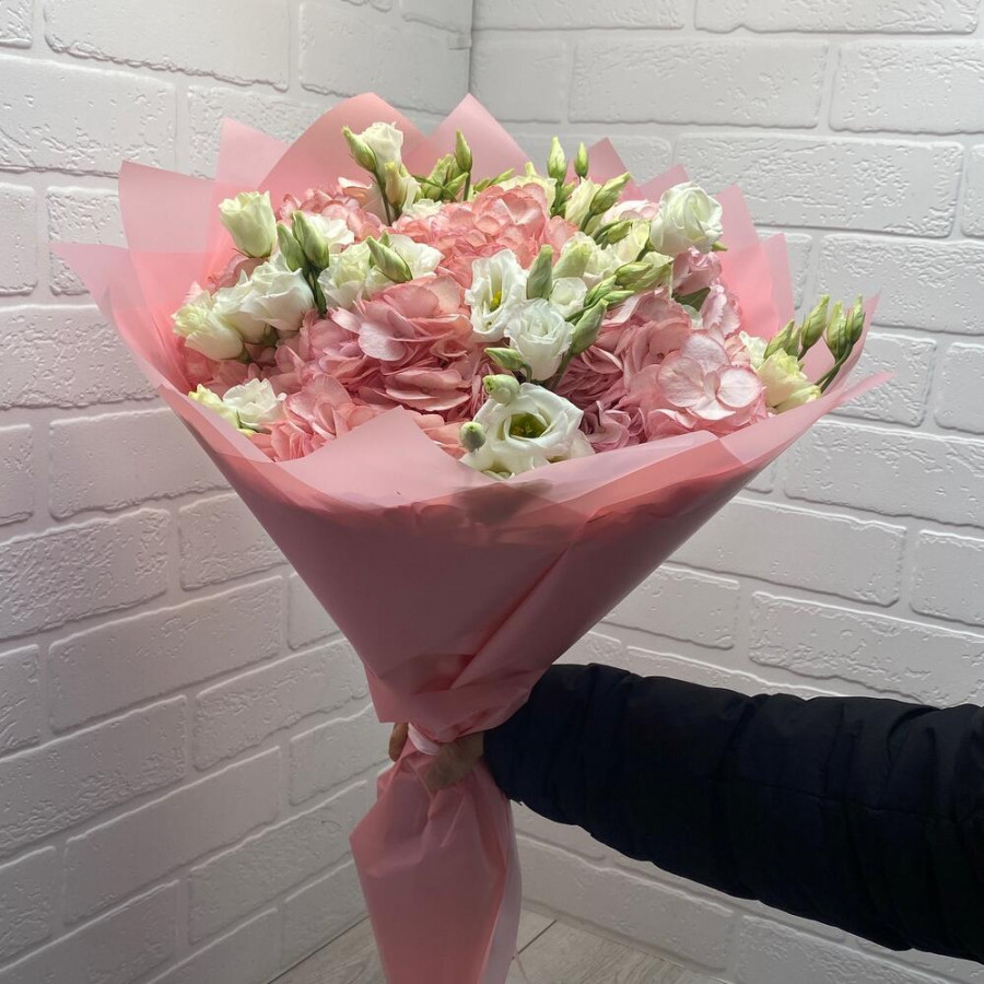 На фото букет из розовых гортензий и белых эустом. В составе: эустома (лизиантус) 7 шт, гортензия 5 шт, дизайнерская упаковка 1 шт, атласная лента 1 шт, . Все цветы свежие и ароматные, букет красиво оформлен и отлично подходит для подарка. Доступна доставка цветов или самовывоз.